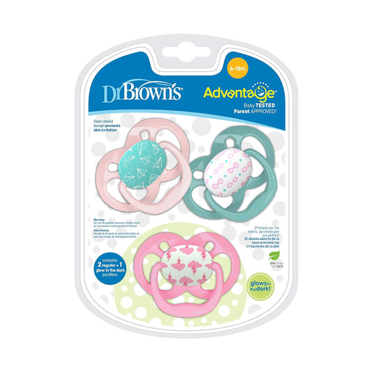 Dr. Brown's Silicone Advantage Baby Pacifiers, Glow In The Dark, Stage 1, 3Count, Pink